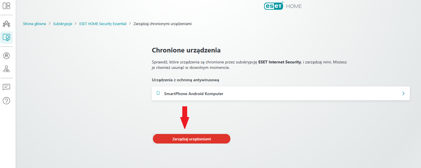 Pojawi się strona z listą dodanych do danej subskrypcji urządzeń (wraz z ich nazwami). Pod spisem wybieramy opcję "Zarządzaj urządzeniami"