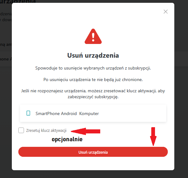 UWAGA! Jeśli nie rozpoznajemy urządzenia, bądź mamy podejrzenie, nieautoryzowanego wykorzystania licencji, z tego poziomu możemy również zresetować klucz licencyjny (opcja dostępna tylko po odpięciu wszystkich urządzeń objętych ochroną za pomocą tej subskrypcji).
